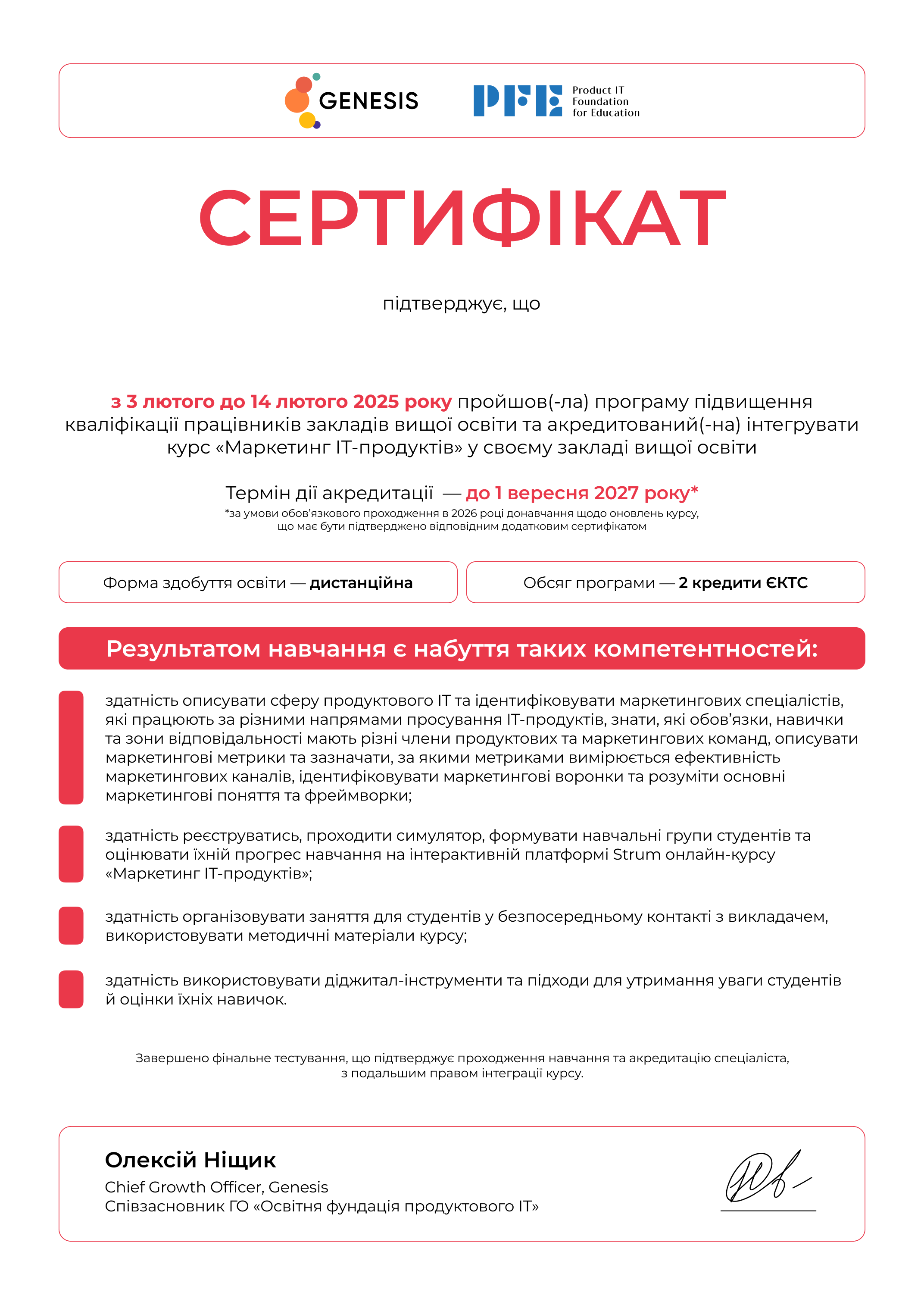 Сертифікат із переліком набутих навичок, який зазначає акредитацію викладача для подальшого викладання курсу «Маркетинг IT-продуктів».